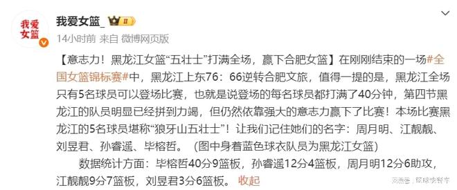 中国篮坛又出现神奇一幕,2025年全国女篮锦标赛第二阶段小组赛,黑龙江女篮迎战合肥女篮,这本是一场关注度并不大的比赛。不过,在这一场比赛中,却出现了神奇一幕,黑龙江女篮全场比赛只有5人登场,这5人直接打满全场,没有任何一秒的休息时间。最终,凭借着这“5壮士”的神勇表现,黑龙江竟然以77-66逆转击败了合肥女篮,成功收获开门红。
