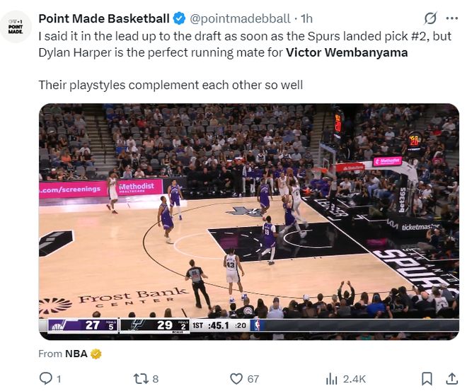 美媒PMB写道:在马刺抽到榜眼签,也就是选秀之前我就说过,迪伦-哈珀会是文班亚马的完美搭档,他们的打法风格都很契合,两人的配合非常之默契。