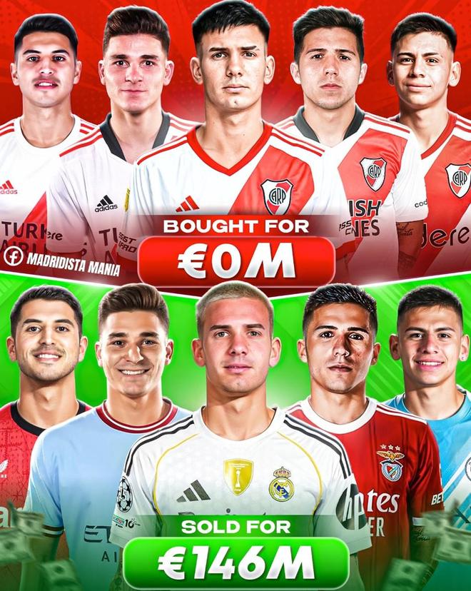 北京时间10月11日,来自Madridista Mania的统计指出,河床近几个赛季通过青训培养的胡利安-阿尔瓦雷斯、恩佐-费尔南德斯以及马斯坦托诺等球员一共为他们带来了1.46亿欧元的转会费收入。