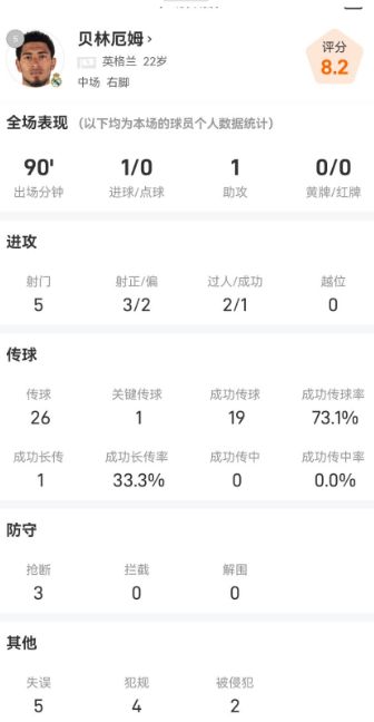 贝林厄姆这场比赛出战90分钟,送出传射建功的好戏,他有着5次打门,其中3次射正2次射偏;贝林厄姆2次尝试过人,其中1次成功。