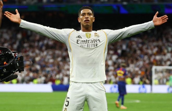 雷速体育10月27日讯 西甲第10轮,皇家马德里主场同巴塞罗那展开国家德比。比赛进行到90分钟时,贝林厄姆被替换下场。这场比赛里,贝林厄姆在场上传射建功,可谓星光四射!